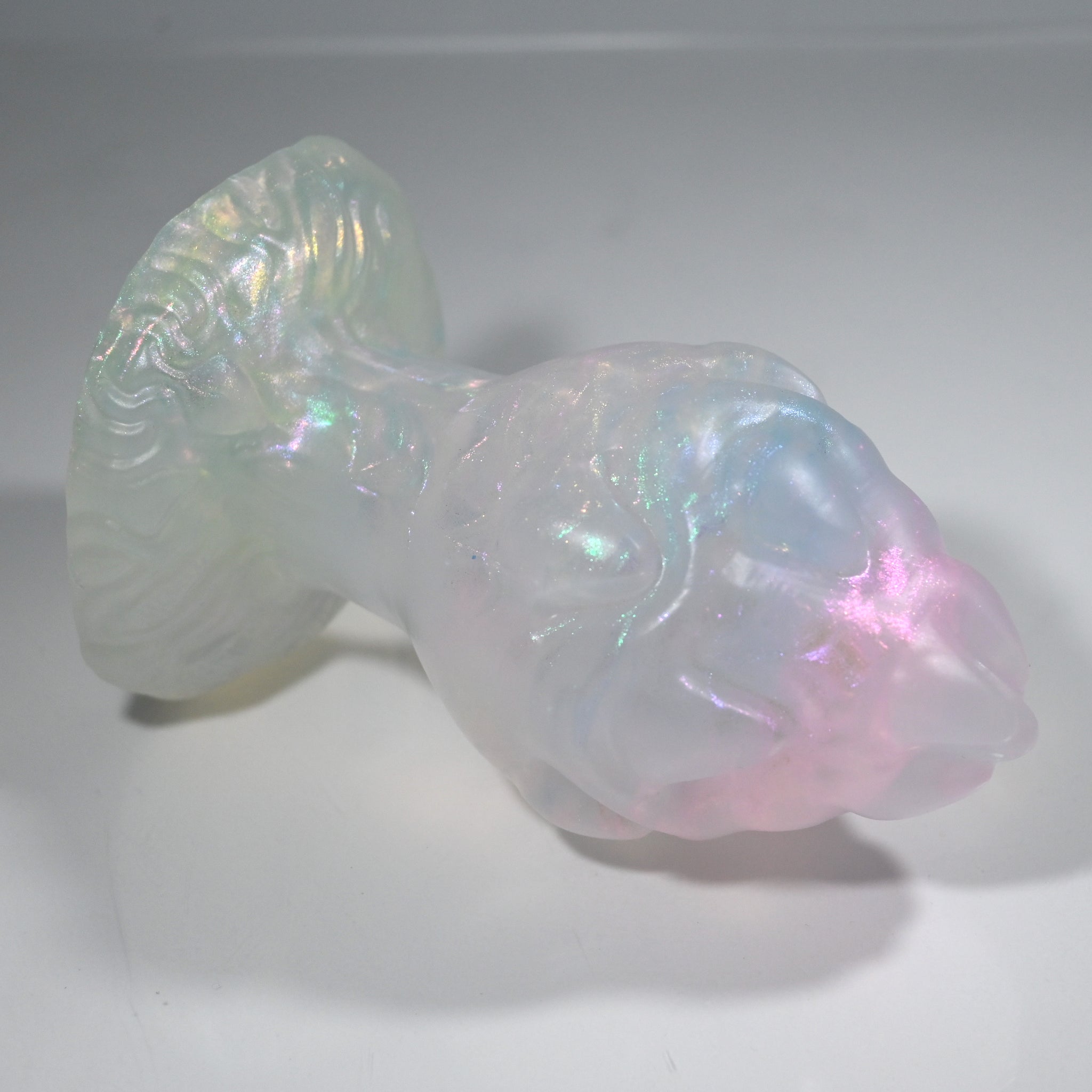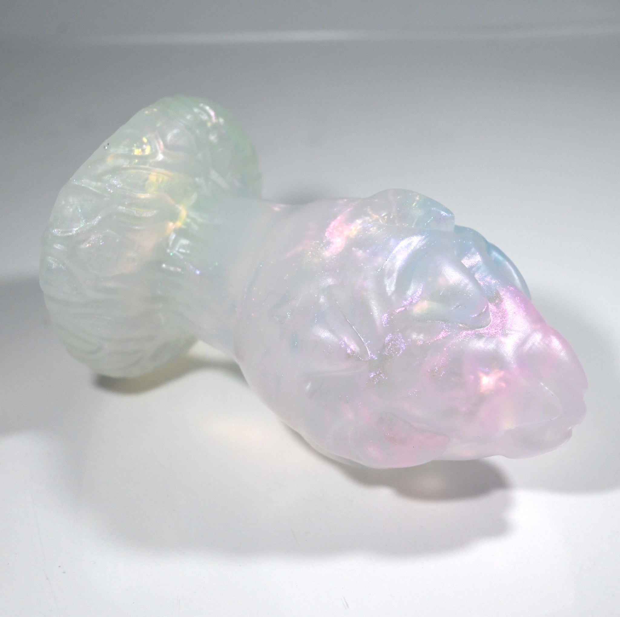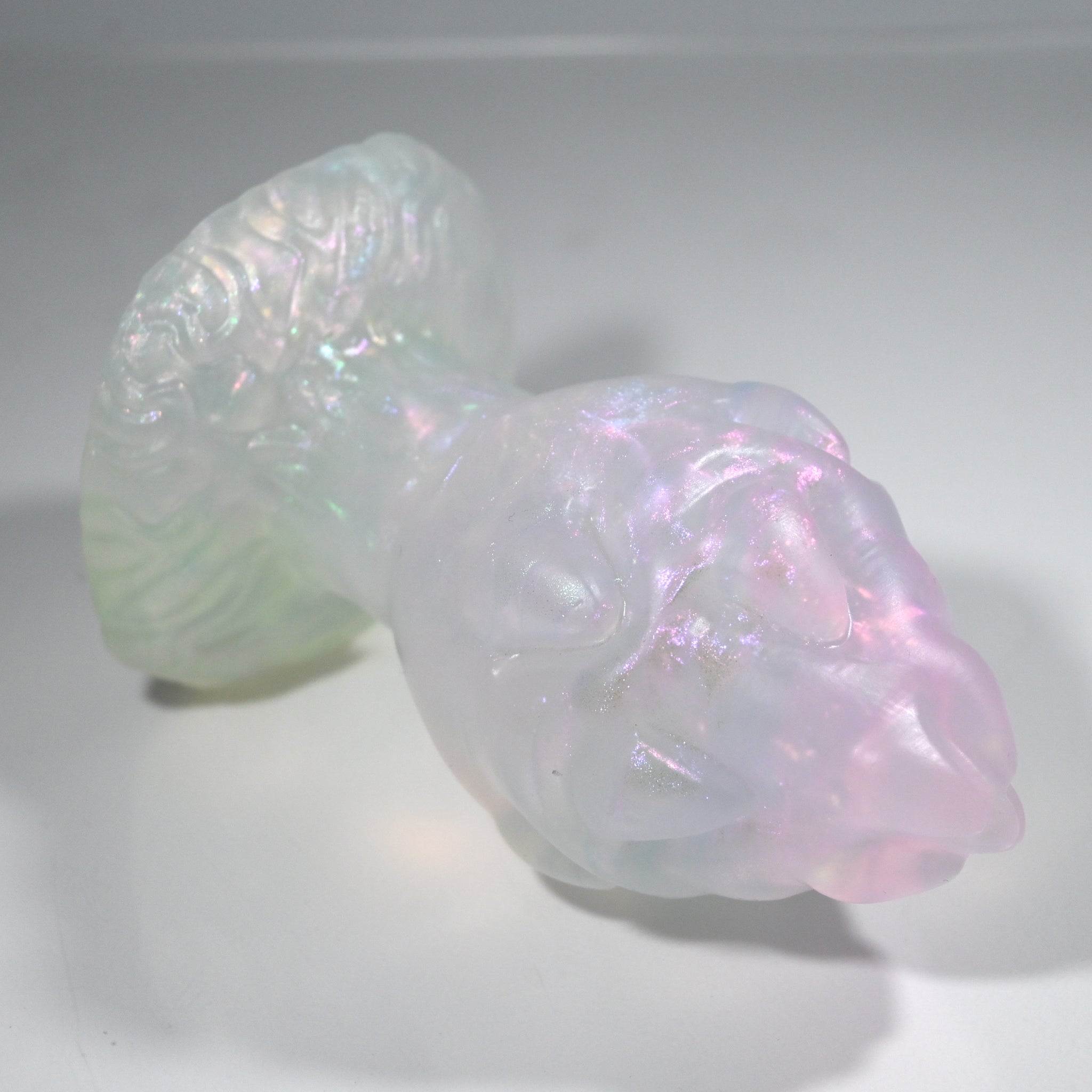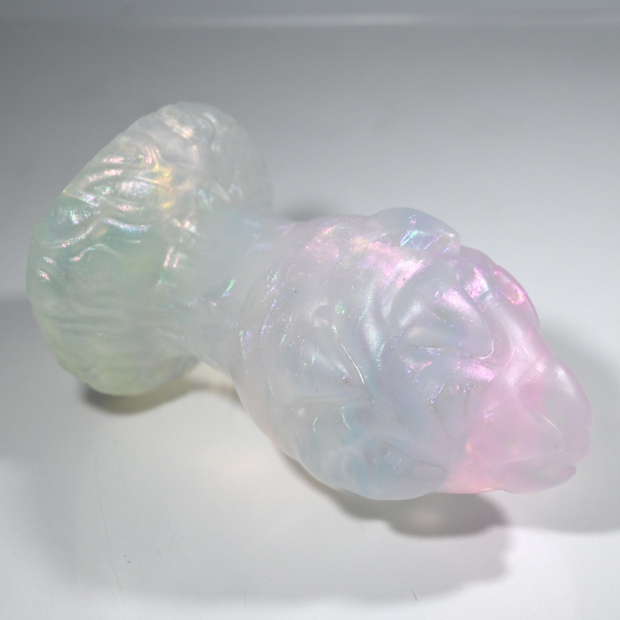 **NOTE: This product is made with Near Clear Ecoflex silicone and will therefore discoloration is more obvious (not more likely) than regular cloudy silicone. Please use extra caution to avoid staining with oil based lubes and bodily fluids. Boiling for long periods of time is not recommended. Please read our FAQ for additional care instructions.