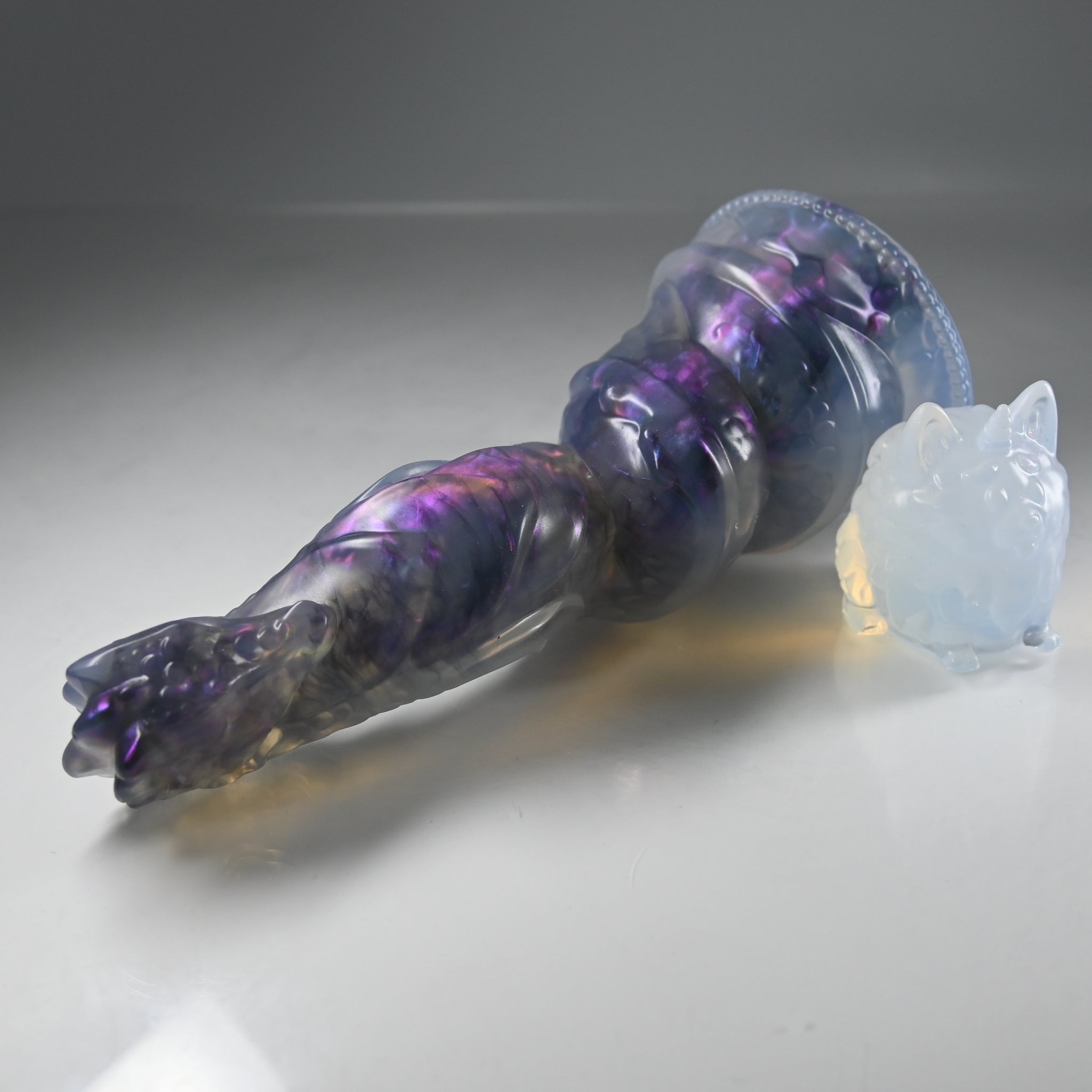 **NOTE: This product is made with Near Clear Ecoflex silicone and will therefore discoloration is more obvious (not more likely) than regular cloudy silicone. Please use extra caution to avoid staining with oil based lubes and bodily fluids. Boiling for long periods of time is not recommended. Please read our FAQ for additional care instructions.