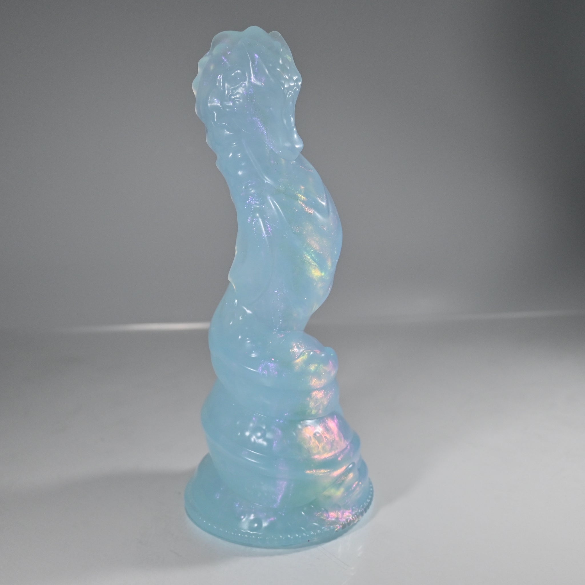 **NOTE: This product is made with Near Clear Ecoflex silicone and will therefore discoloration is more obvious (not more likely) than regular cloudy silicone. Please use extra caution to avoid staining with oil based lubes and bodily fluids. Boiling for long periods of time is not recommended. Please read our FAQ for additional care instructions.