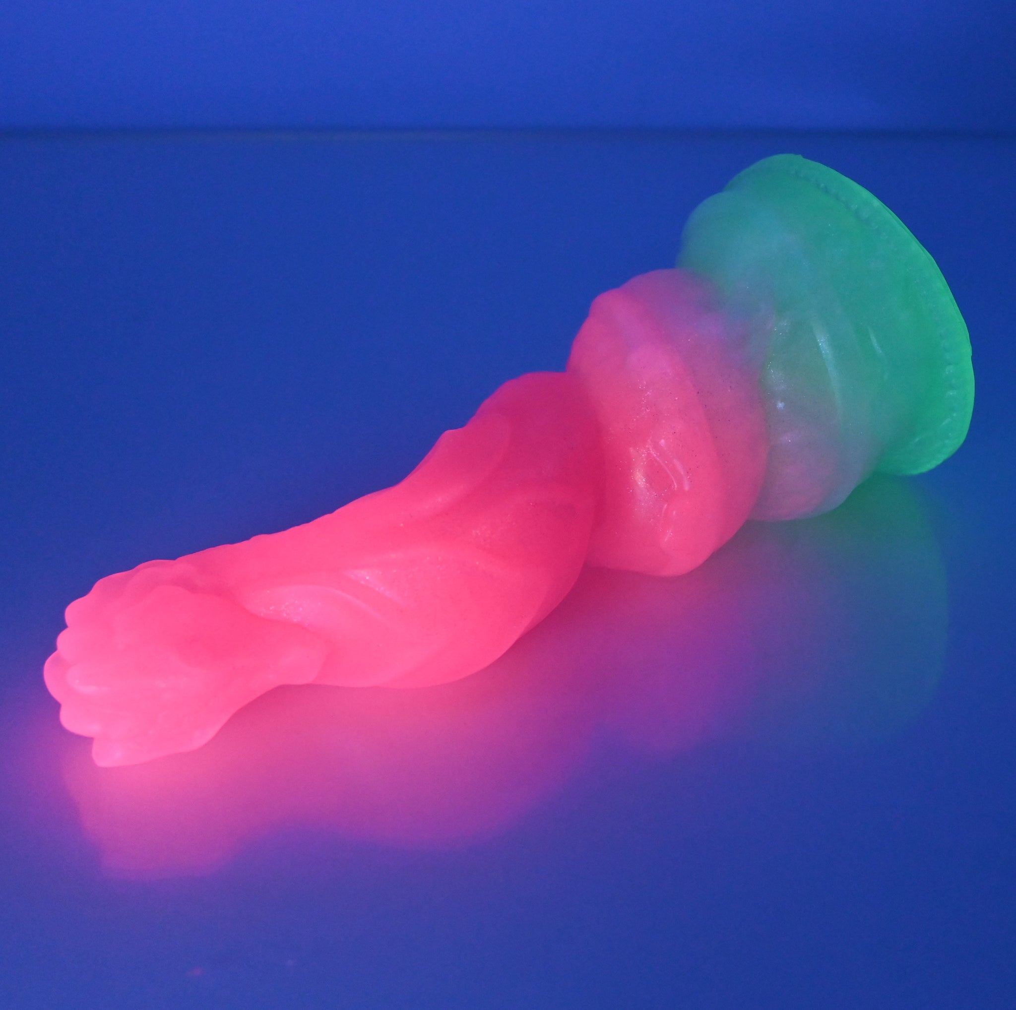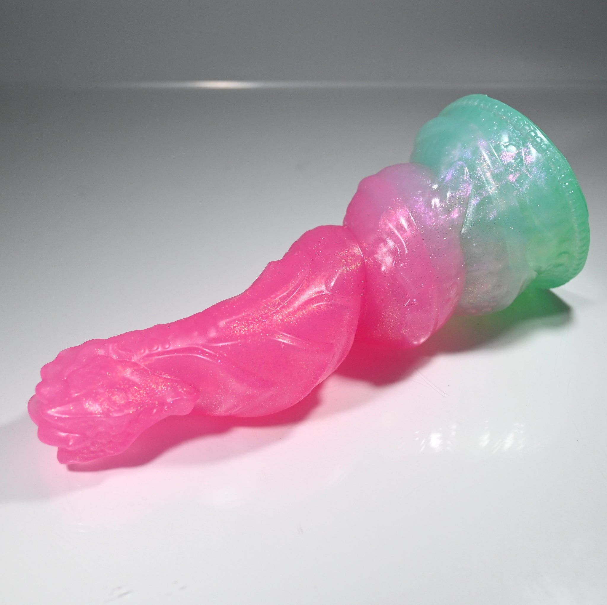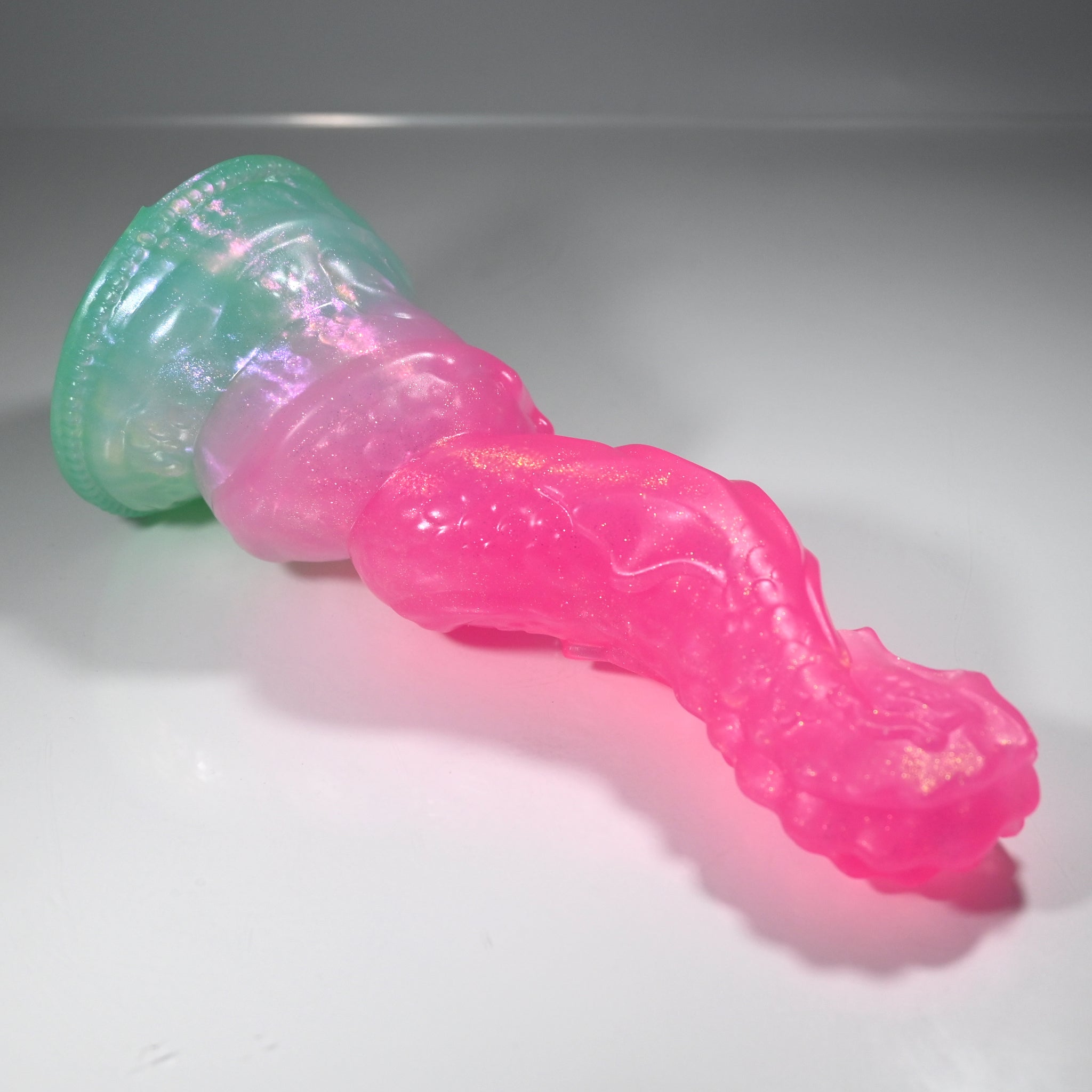 **NOTE: This product is made with Near Clear Ecoflex silicone and will therefore discoloration is more obvious (not more likely) than regular cloudy silicone. Please use extra caution to avoid staining with oil based lubes and bodily fluids. Boiling for long periods of time is not recommended. Please read our FAQ for additional care instructions.