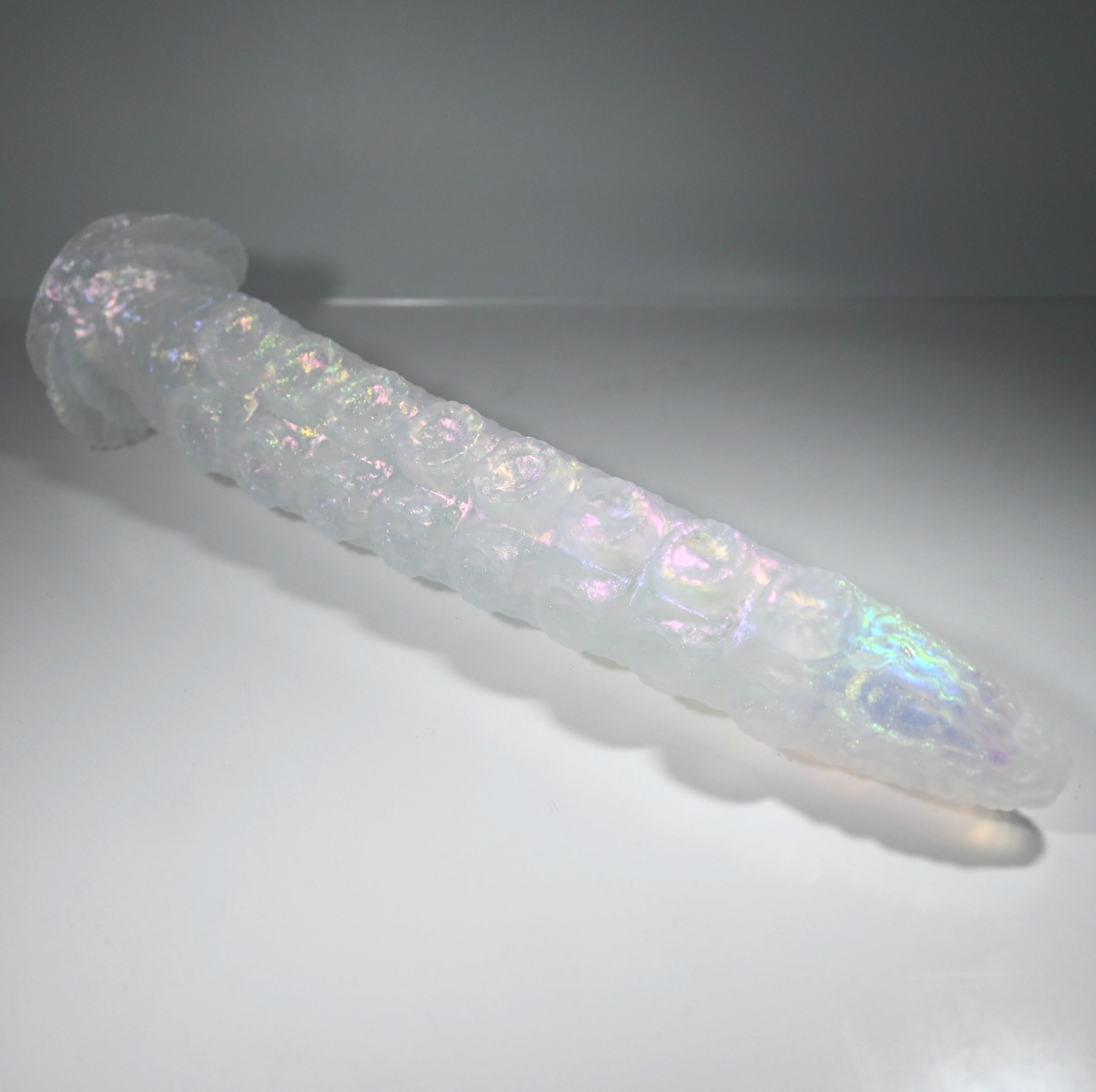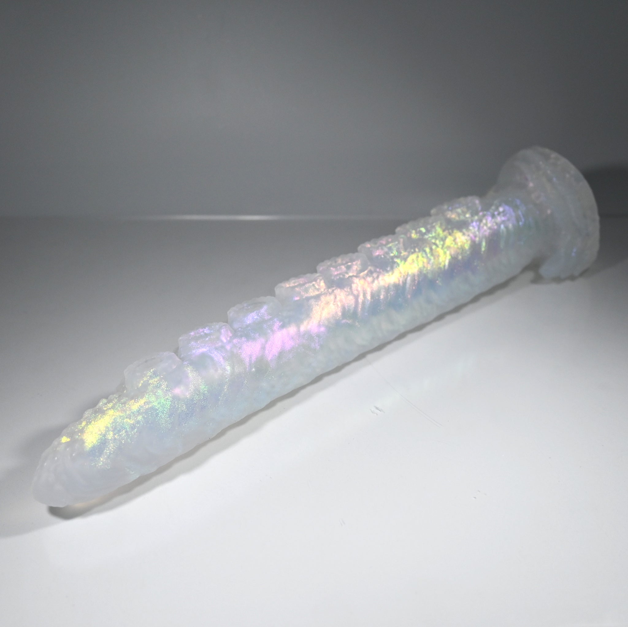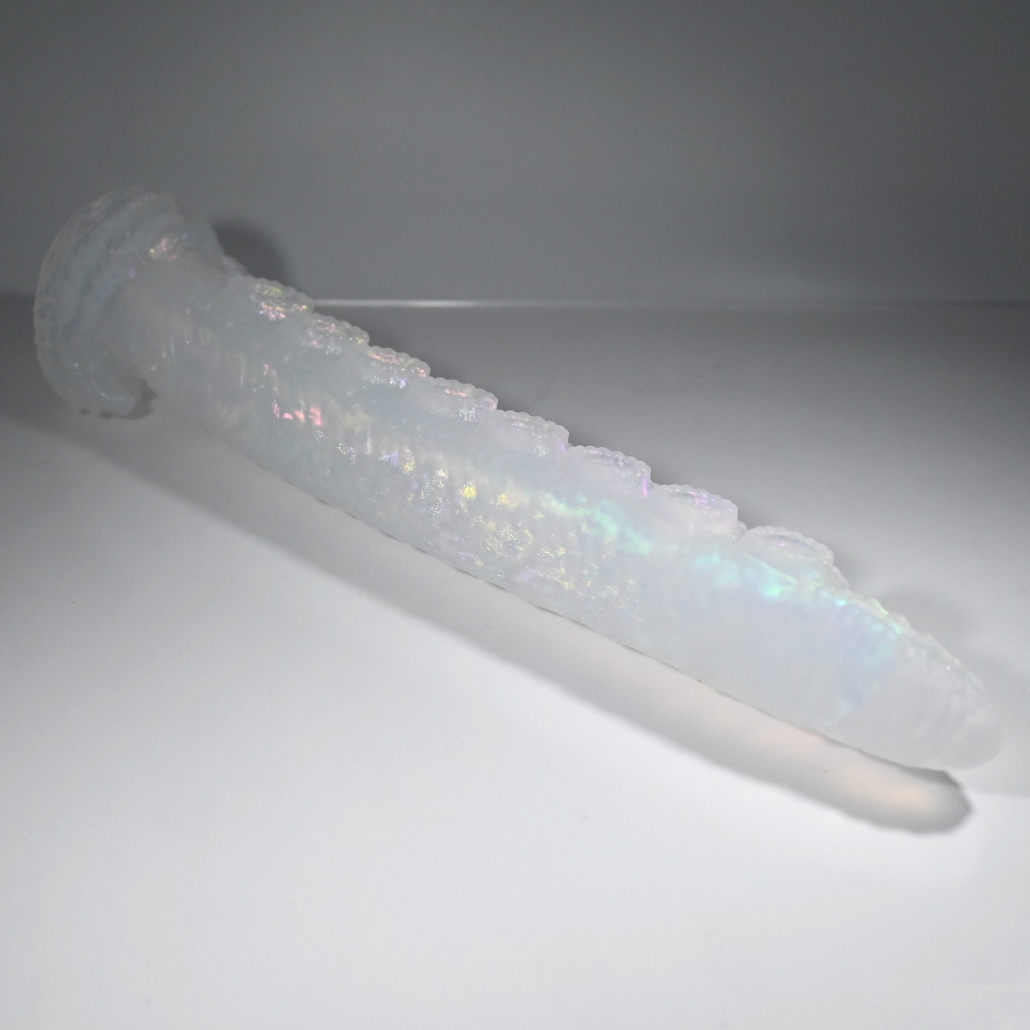 **NOTE: This product is made with Near Clear Ecoflex silicone and will therefore discoloration is more obvious (not more likely) than regular cloudy silicone. Please use extra caution to avoid staining with oil based lubes and bodily fluids. Boiling for long periods of time is not recommended. Please read our FAQ for additional care instructions.